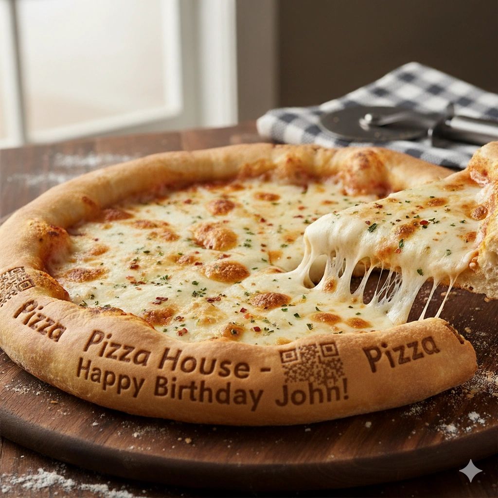 A pizza pie features a custom message and scannable QR code baked right onto the surface — turning every pie into a memorable, interactive experience that boosts brand visibility, engagement, and shareability. It’s not just food; it’s a marketing moment customers can taste and share.